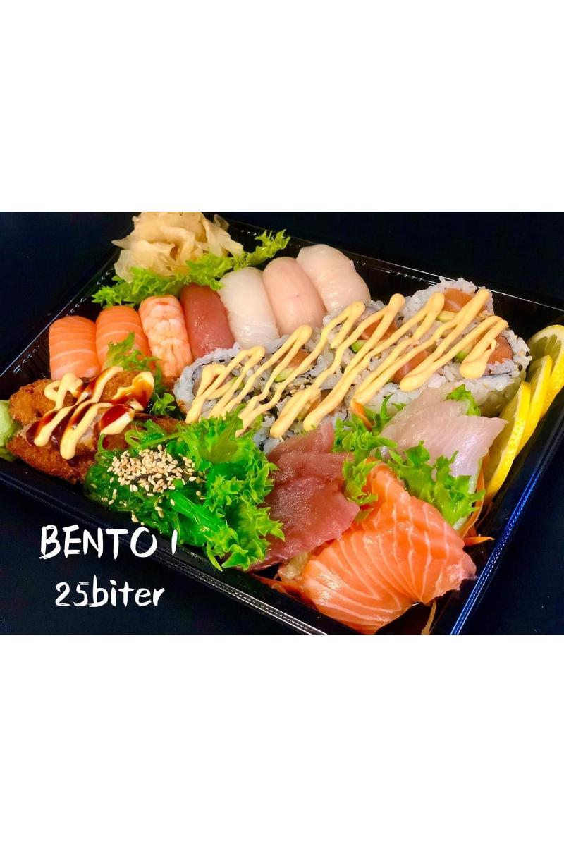 6 nigiri, 8 spicy laks maki, 9 sashimi, 2 innbakt scampi og wakame