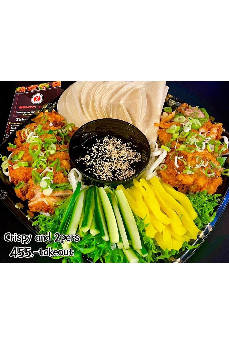 Frityrstekt and, agurk, vårløk, gulrot og pannekaker