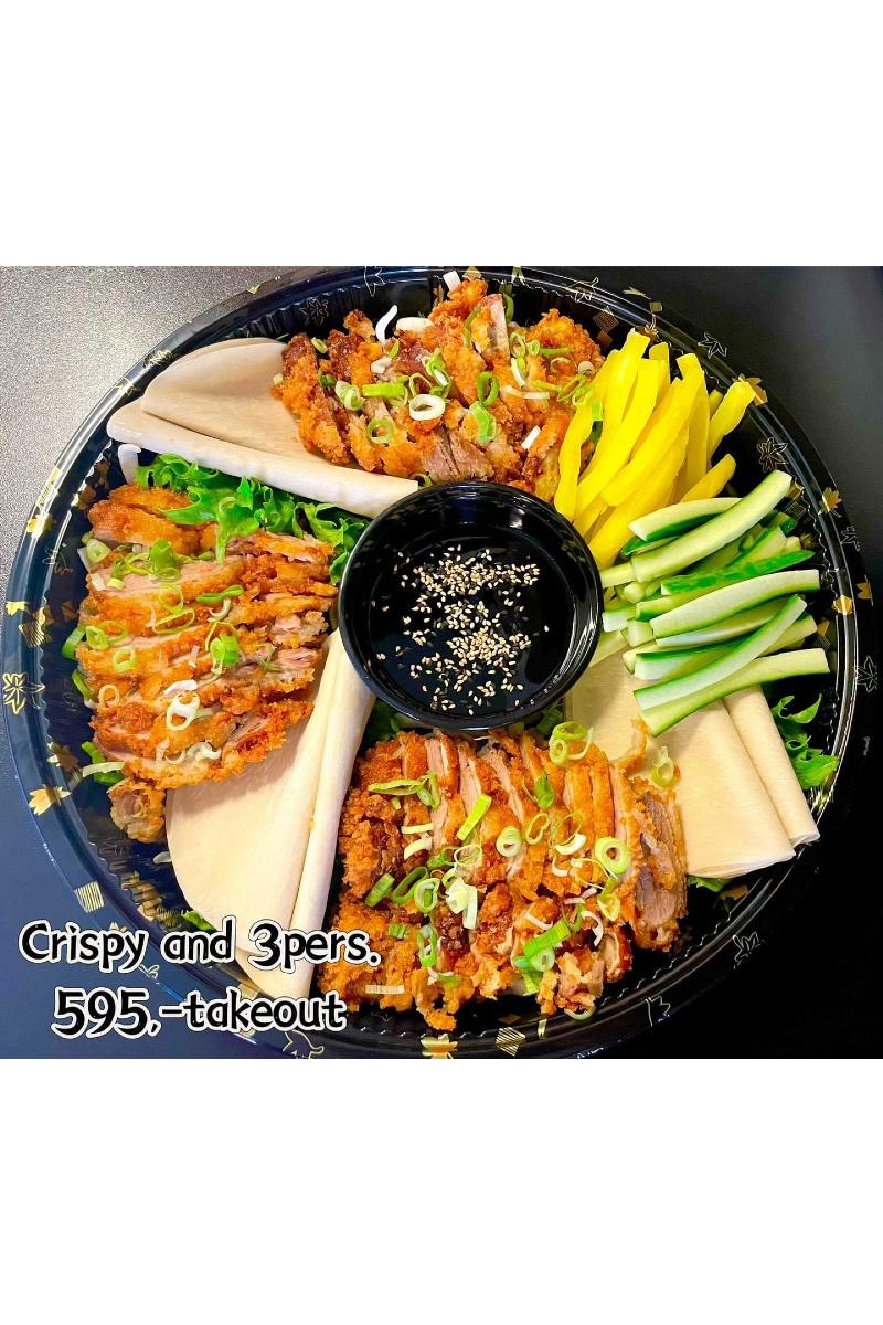 Frityrstekt and, agurk, vårløk, gulrot og pannekaker