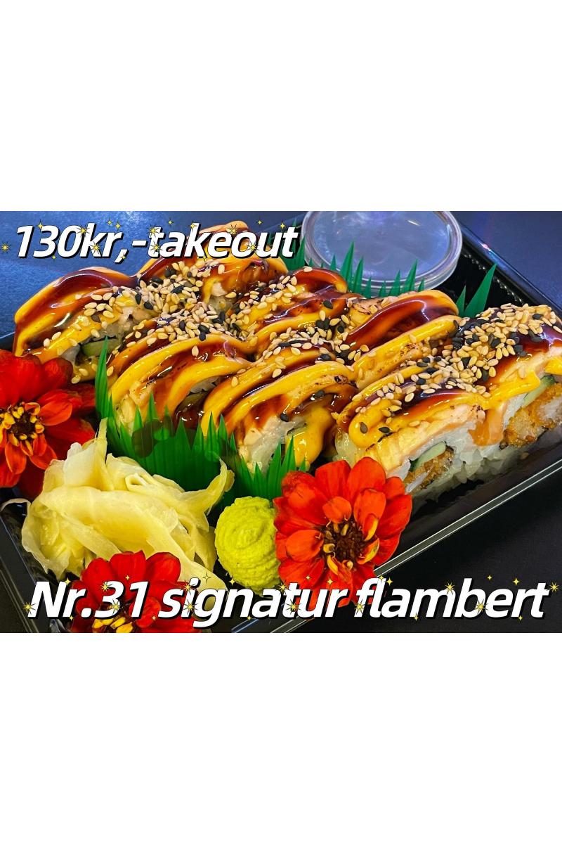 Tempura scampi og avokado inni. Flambert laks og teriyakisaus på toppen